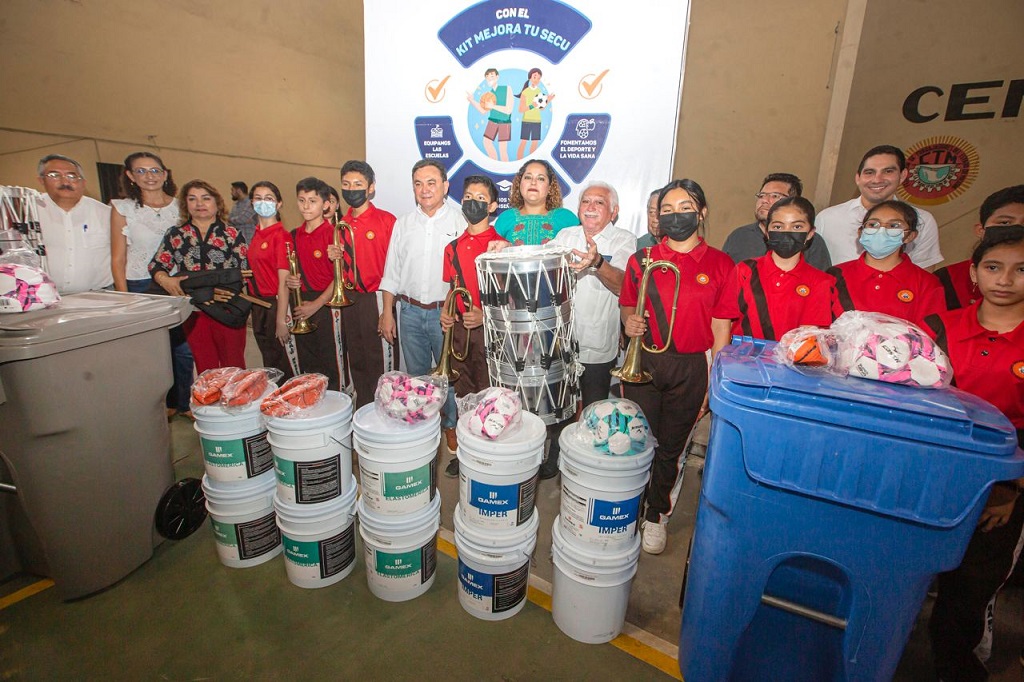 La estrategia "Mejora tu Secu" tiene la meta de distribuir 463 kits para los centros educativos de este nivel. Los paquete contienen: 1 proyector multimedia, 2 contenedores de basura, 5 cubetas de pintura blanca de 19 litros, 3 cubetas de pintura azul de 19 litros, 3 cubetas de impermeabilizante de 19 litros, así como 5 balones de futbol y 5 de basquetbol.
